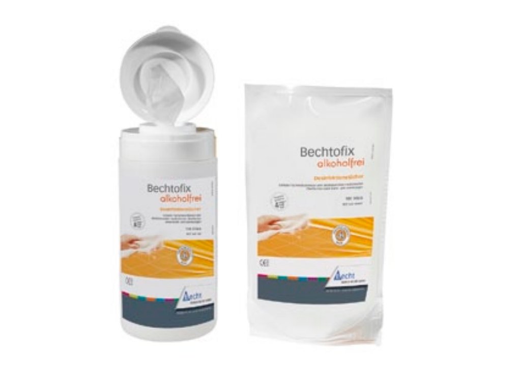 Bechtofix Plus bez alkoholu – ubrousky o rozměrech 14 × 20 cm se dodávají v praktické plastové