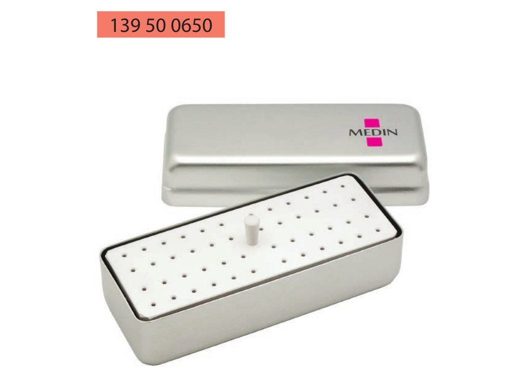 Endobox - malý pro 48 kořenových nástrojů. Kazeta a stojánek z eloxovaného hliníku rozměr 134x51x50mm