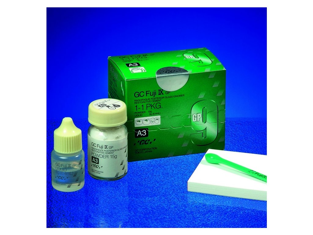 Kondenzovatelný skloionomerní cement se zvýšenou mechanickou pevností, 2x8g(6.4ml) tekutina a 3x15g prášku v odstínech A2,A3,B3.