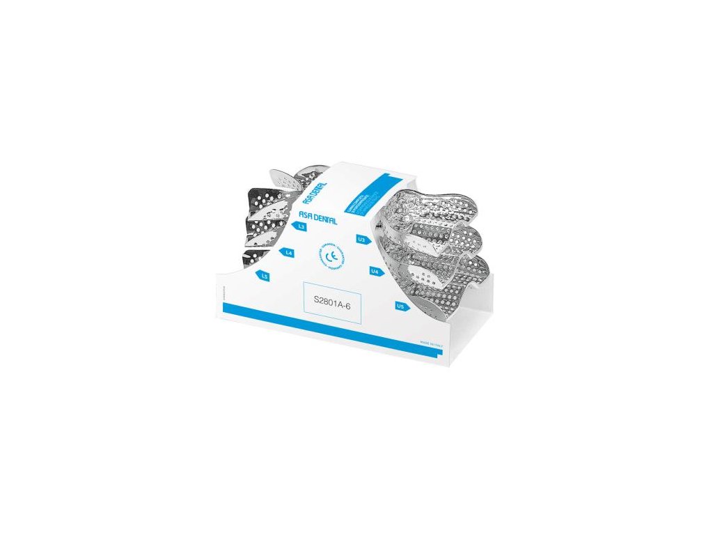 Perforované otiskovací lžíce bez retenčního okraje vyrobené z nerezavějící oceli.