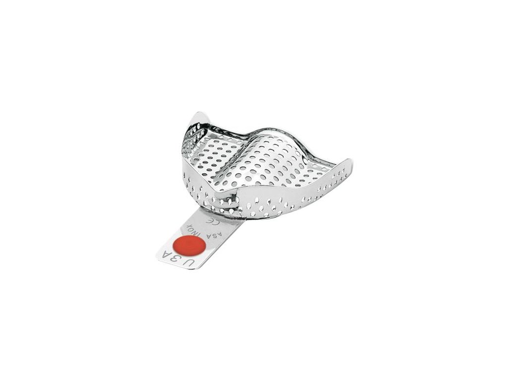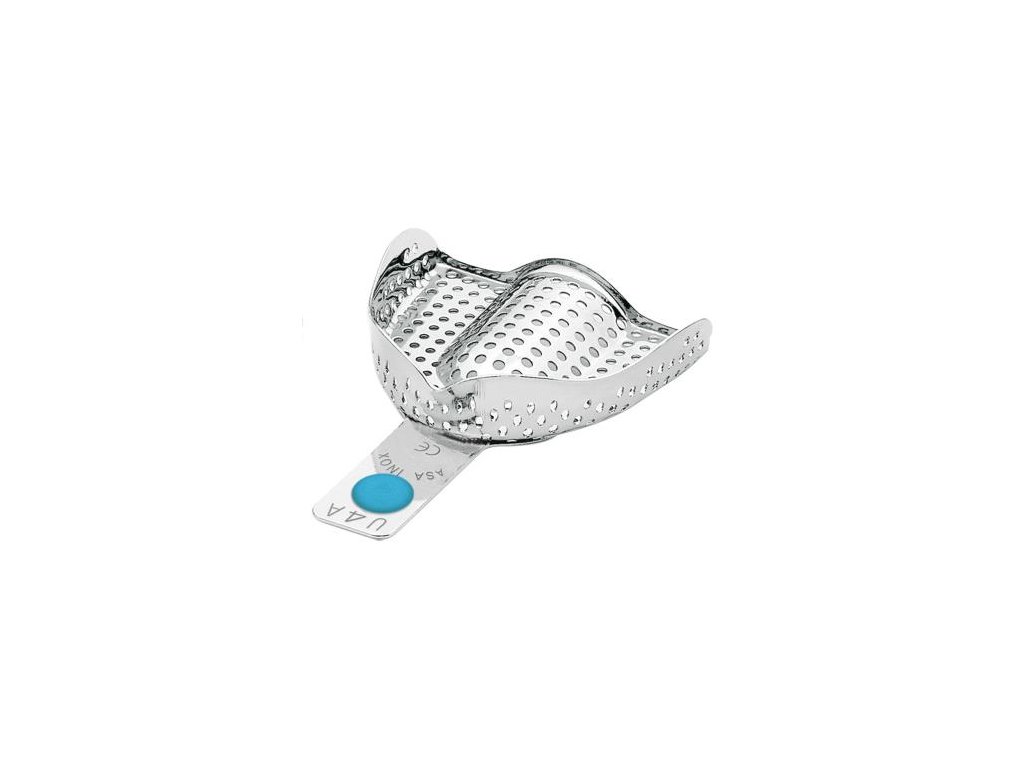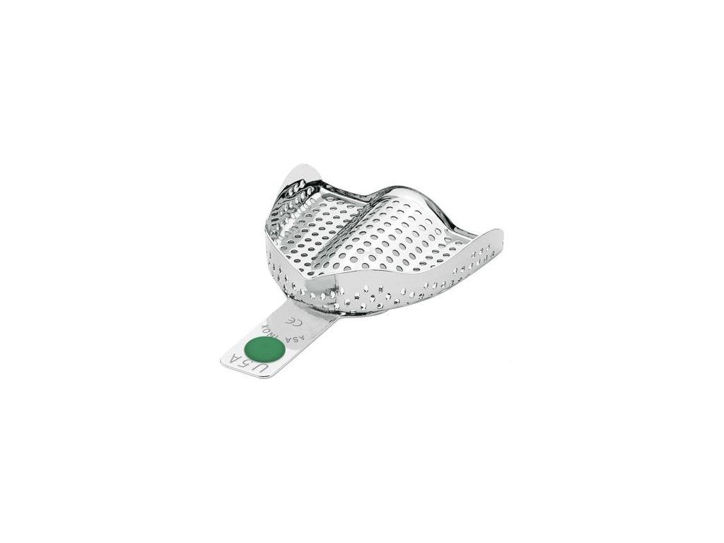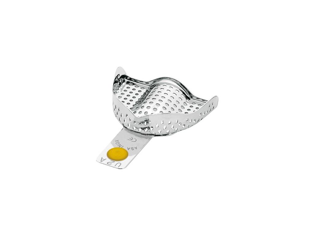 Perforované otiskovací lžíce horní bez retenčního okraje vyrobené z nerezavějící oceli.