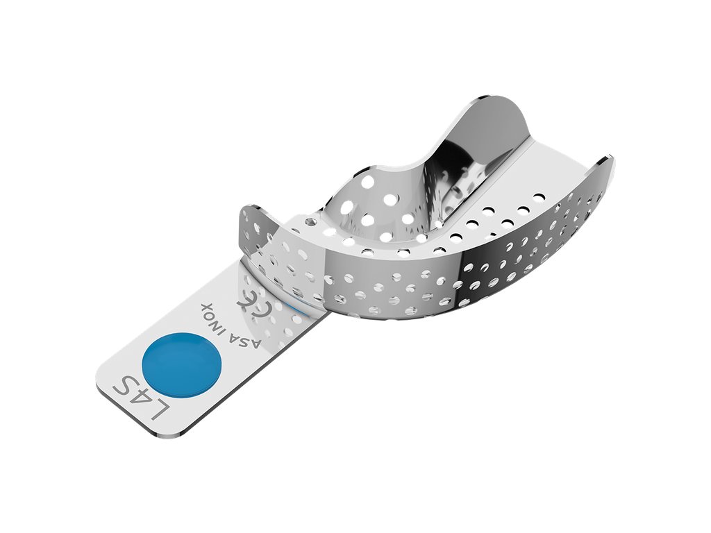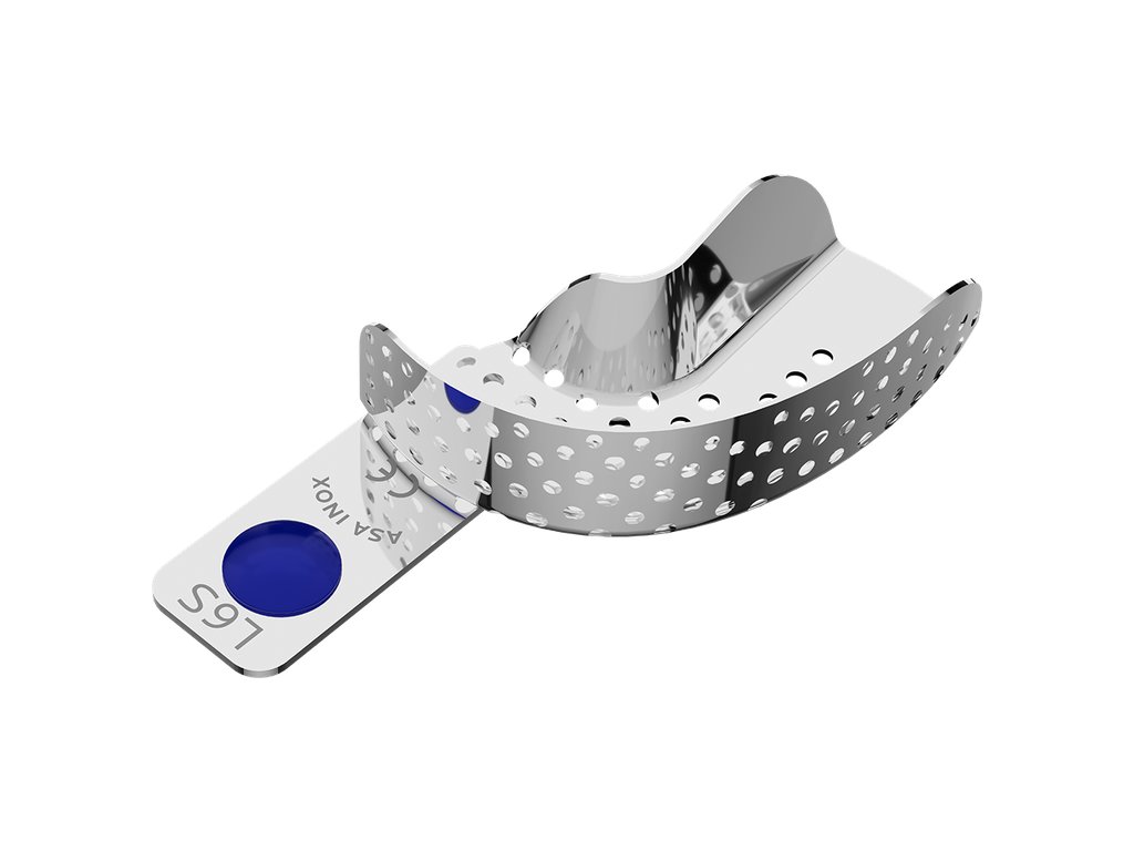 Perforované otiskovací lžíce dolní částečné (levé) bez retenčního okraje vyrobené z nerezavějící oceli.